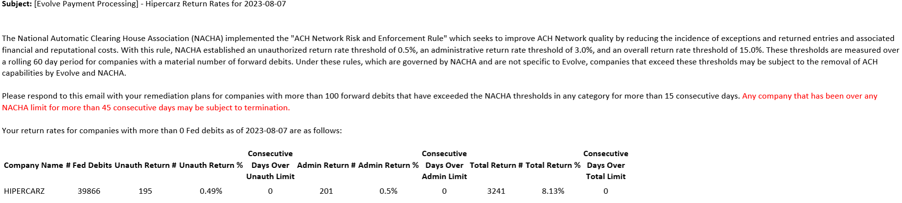 Evolve ACH Origination clients can work with their Account Management or Implementation contacts to opt into an ACH Return Rates email. This email is be sent on a weekly basis and contains important information regarding their ACH return rates including number of ACH debits, count and percentages of returns, days over limit and more. Below is an example of this email.